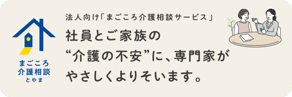「まごころ介護相談とやま」は、企業の福利厚生として導入できる法人向けの介護相談サービスです。